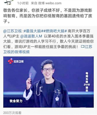 主持人蔣昌建說(shuō):“我們一般的印象,當(dāng)然是刻板印象,覺(jué)得玩游戲的人好像成績(jī)都不一定特別的好。”