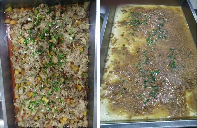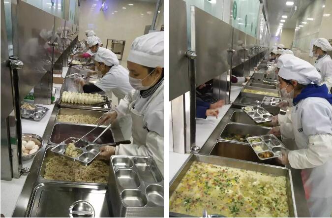 食堂從業人員全部持健康證上崗,上班時間統一規范著裝,所有人員佩戴工衣、工帽、口罩、圍裙,不得穿戴手表、飾物等。他們嚴格按照《餐飲服務食品安全操作規范》進行加工操作,做到食物燒熟煮透、生熟分開,嚴格落實用具分類制度,防止食物交叉污染。師生飯菜同時烹飪。