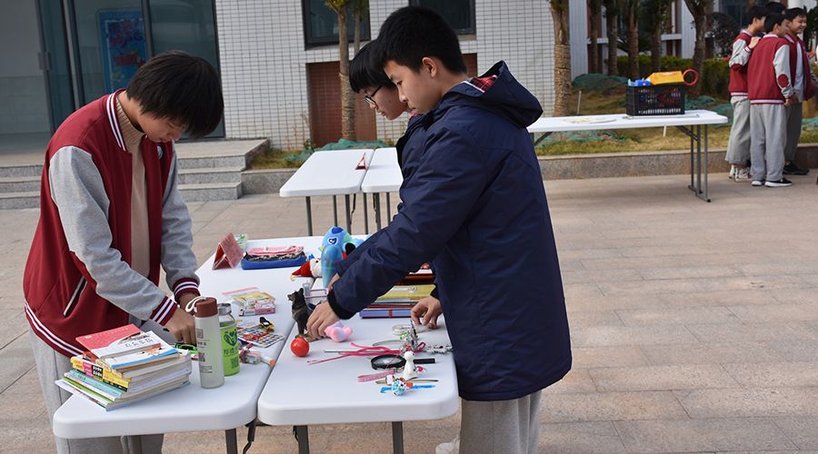 1月5日下午3:30,學部各班級同學就迅速行動起來,將精心準備好的義賣物品、橫幅、銷售裝備等拿到攤位。各班級快速有序的將自家“超市”布置完畢,校園瞬間被點燃,集市人山人海。每家“超市”都別出心裁的通過標語、口號展示自家店鋪的特色。