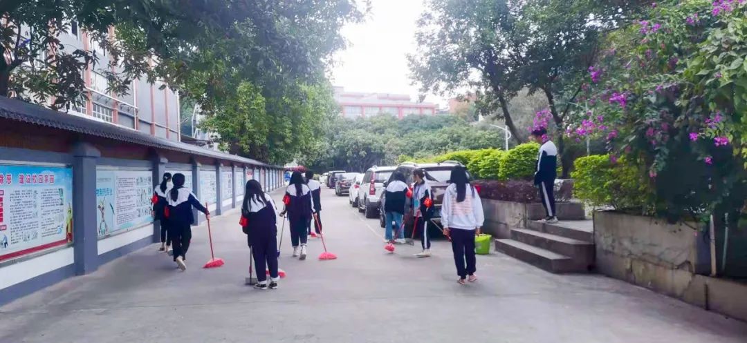 提前到達操場的是王廷榮、黃詩文、李仁懷、李燦彬、溫善媛等同學。他們揮動著掃把便開始“沙沙”地清掃落葉,掃地的聲音好像鳥兒在對他們唱歌,又像是在鼓勵他們:“勞動的孩子最美麗”。