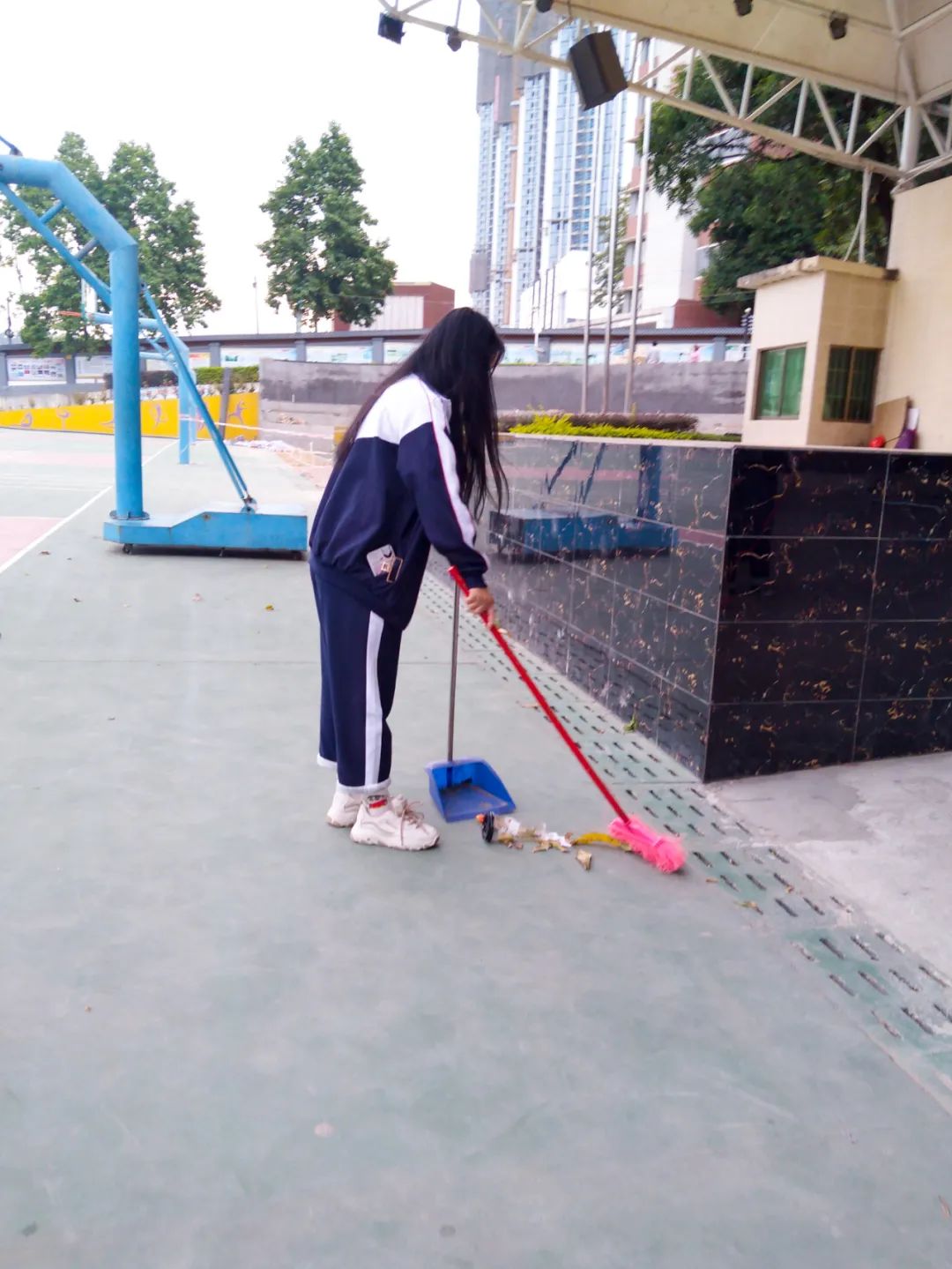 清晨,志愿者在陽光下打掃校園