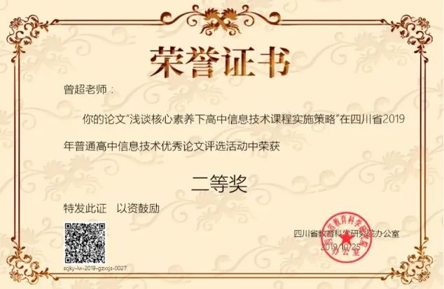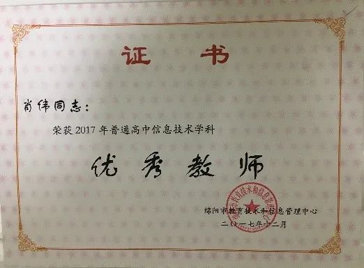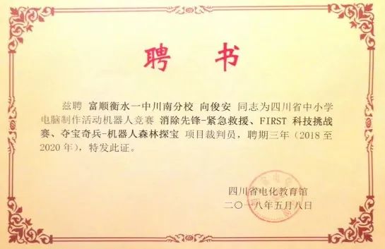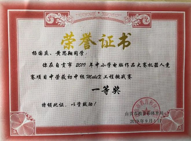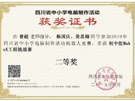 學(xué)生獲2019年四川省中小學(xué)電腦制作活動(dòng)機(jī)器人競(jìng)賽省二等獎(jiǎng)1項(xiàng)、三等獎(jiǎng)2項(xiàng)。