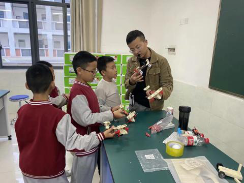 有一些語數課上的“笨孩子”,在科學大課堂上非常活躍,在完成任務的基礎上還樂于幫助其他同學,課后也會常常找柴老師詢問關于制作方面的問題。除了講授每個小制作的原理,教學生組裝最基礎的零件,柴老師還別出心裁,將原來滑翔機上的零件拆下來改造成了水上自由漂浮的小船。這讓學生對這些小制作更感興趣,原來只要簡單地轉化一下思維,稍加改動,就可以變成新的小玩意兒。